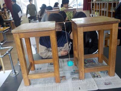5年生理科「ふりこ」の学習。椅子や竹ひご、粘土を使って、手作りのふりこを作り、速度や周期について調べていました。「音楽のリズムをはかる機械(メトロノーム)に、似てる!」などと言いながら、真剣にふりこの動きを観察する子どもたち。糸の長さによって1往復する時間が変わるのかどうか、真剣に考える姿が印象的でした。