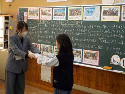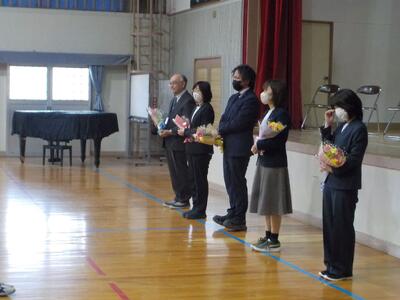 また、8名の先生方・調理員さんとお別れする離任式も行いました。6年間という長い間、口石小学校のため、子どもたちのために、精一杯ご尽力いただきました。新天地でのご活躍をお祈りいたします。
