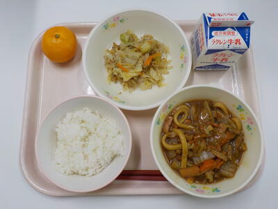 今日の給食は、少なめごはん、牛乳、味噌煮込みうどん、キャベツともやしの煮浸し、みかんです。
