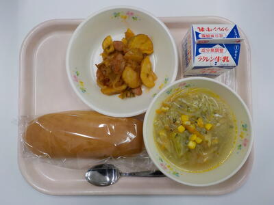 今日の給食は、コッペパン、牛乳、ジュリアンスープ、ジャーマンポテトです。