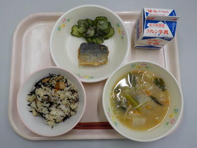 今日の給食は、ひじきご飯、牛乳、大根のみそ汁、さばの唐揚げ、ゆかりあえです。