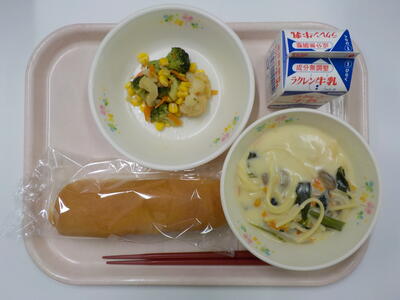 花野菜のサラダのサラダは、色どりがよく美味でした。スープスパゲッティは、麺の硬さが丁度良くクリーミーで、とてもおいしい給食でした。ごちそうさまでした。