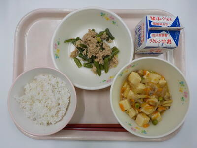 今日の給食は、麦ごはん、牛乳、ジージャー豆腐、いんげんの炒め煮です。