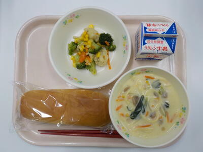 花野菜のサラダのサラダは、色どりがよく美味でした。スープスパゲッティは、麺の硬さが丁度良くクリーミーで、とてもおいしい給食でした。ごちそうさまでした。