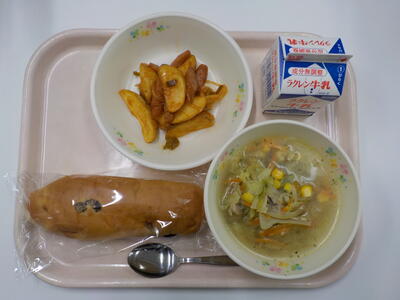 今日の給食は、レーズンパン、牛乳、ジュリアンスープ、ジャーマンポテトです。