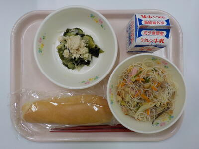 チキンとわかめのサラダは、さっぱりとしていて美味でした。焼きビーフンは、焼き具合が丁度良くとてもおいしい給食でした。ごちそうさまでした。
