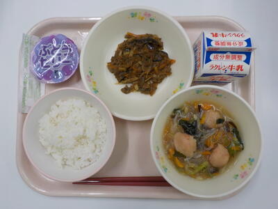 今日の給食は、ごはん、牛乳、えび団子のスープ、マーボーなす、ぶどうゼリーです。