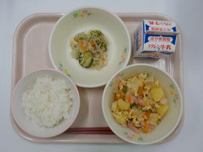 今日の献立は、牛乳、ごはん、親子煮、切干大根の酢の物でした。親子煮は、卵も凍り豆腐も柔らかく、口当たりがよかったです。切干大根の酢の物は、お酢の加減も丁度良く、美味しくいただきました。