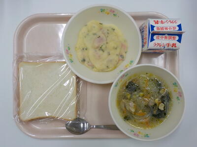 今日の給食は、食パン、牛乳、コンソメスープ、じゃがチーズです。