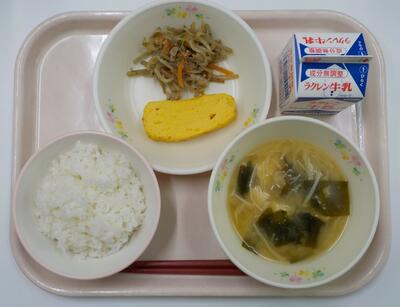 今日の給食は、ごはん、牛乳、じゃがいものみそ汁、厚焼き卵、浦上そぼろです。