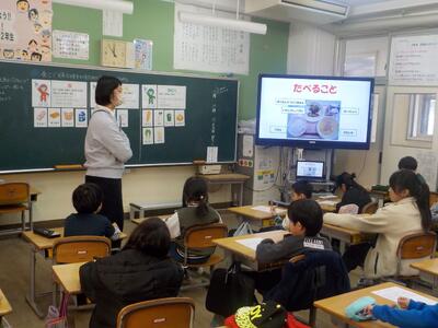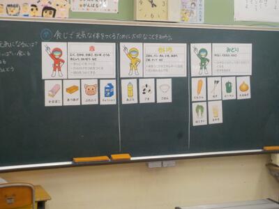 食育指導の一環として、栄養教諭が2年生で授業を行いました。今日は、赤(体をつくる)、黄(エネルギー源)、緑(体の調子を整える)の3色の食品群について知り、バランスよく食事をすることの大切さを学びました。自分で3色を意識しながら食事できるよう、これからも働きかけていきます。