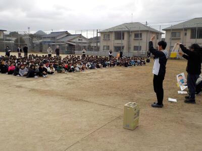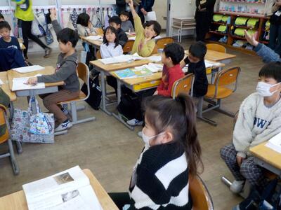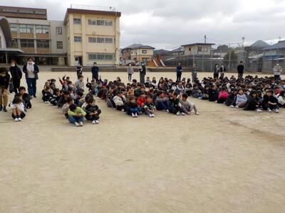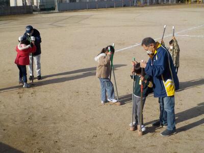 今日は、老人会の方に来ていただき、1年生が昔遊びを体験しました。けん玉や竹馬、めんこやあやとりなど、子どもたちはとても楽しそうでした。寒い中に、ゲストティーチャーとして子どもたちに優しく教えてくださった老人会の皆様、ありがとうございました。
