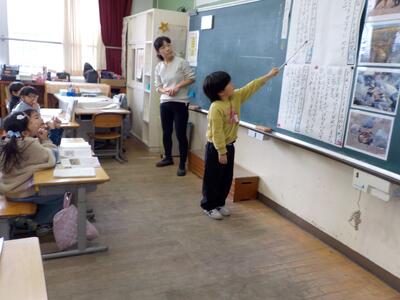 ・黒板の前に出て、文章を指さしながら説明する子ども