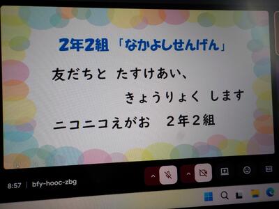今日の1校時、リモートで人権集会を実施しました。校長先生のお話を聞いた後、人権担当から「ともだち」という絵本の読み語りと、各学級で作成した仲良し宣言の発表を行いました。最後に、「ビリーブ」の歌を歌って、さらに人権への意識を高めました。