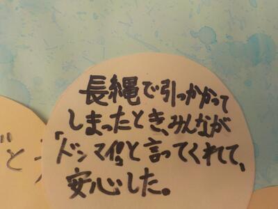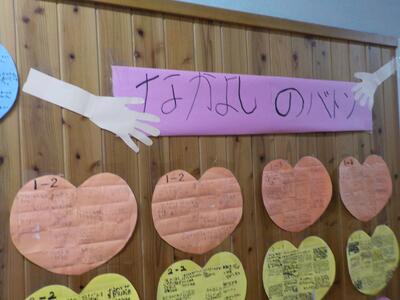 自分が言われてうれしかった「ふわふわ言葉」をカードに書き、掲示しています。「長縄のときに、ドンマイと言ってくれて安心した。」「ありがとうって言われて嬉しかった。」など、読んでいるだけで心が温かくなります。