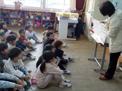 朝の時間、佐々町内の保育園の先生方が、1年生に絵本の読み語りをしてくださいました。幼保小連携の取組の一つで、毎年来校してくださっています。今日は、冬にまつわる絵本や人権に関する歌など、心温まるお話でした。久しぶりにお会いした先生もいて、子どもたちも大喜びでした。保育士の皆さん、お忙しい中に、ありがとうございました。