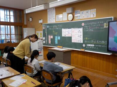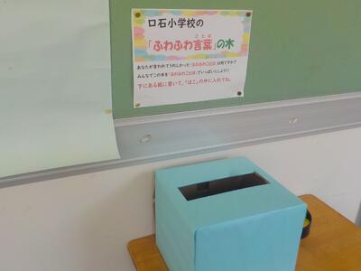 人権を大切にする基本は、人に対しての言葉遣いです。心を傷つける「チクチク言葉」ではなく、「ありがとう」や「すごいね」など、前向きになれる「フワフワ言葉」であふれる口石小学校を創っていきたいと思います。
