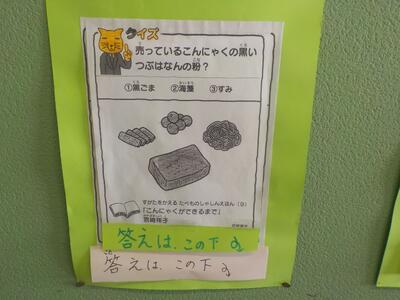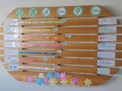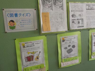 口石小では、年間を通して、学校全体で読書啓発を行っています。2階渡り廊下には図書クイズが、図書室の入り口には読書メーターが掲示されています。一人でも多くの子が本の楽しさを知り、読書で人生を豊かにできるよう、取組を継続していきます。