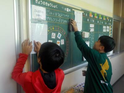 給食委員会の子どもたちは、毎日交代で、給食のメニューを掲示板に記入してくれています。「明日は何かな?」「お、好きなメニューだ。」と和気あいあいと楽しそうに仕事をしています。その姿を見ていると、こちらも自然に笑顔になります。
